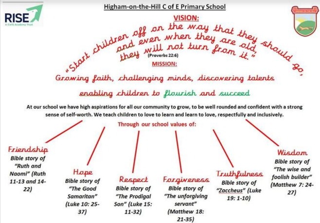 Higham on the Hill C of E Primary School encourages and promotes Christian Values.  We actively live out our values during our school day and beyond and reflect on all of the values we uphold across the year.